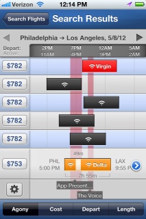 Now let’s move on to Hipmunk’s iPad app, which is free and represents a spot-on translation of the Web experience. Put another way, the Hipmunk iPad app is, for the most part, a large version of its iPhone cousin with a few added features. This approach has its merits, but it also conflicts with my guiding principle for Universal or iPhone / iPad app combinations. For those of you do not attend my iPhone / iPad or App classes (currently in Philadelphia) here it is again: The iPhone is for Now; the iPad is for Wow!
