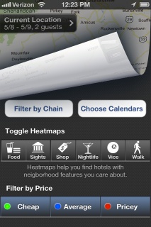 My own research revealed apps that are making the most out of their screen real estate. One app uses the space for a large seat guide, while another searches for hotels with a sweeping radar motif — complete with the beeps. I also downloaded the Priceline Negotiator iPad app which takes advantage of sound and motion, as well as its alternative approach to hotel search. I encourage you to check it out.